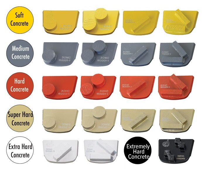Metal Bond Diamond Tools are used for concrete grinding and are made in different grit sizes – 14, 30, 50, 70, 120, and in a different bond for different types of concrete – Soft, Medium, Hard, Extra Hard and Super Hard.