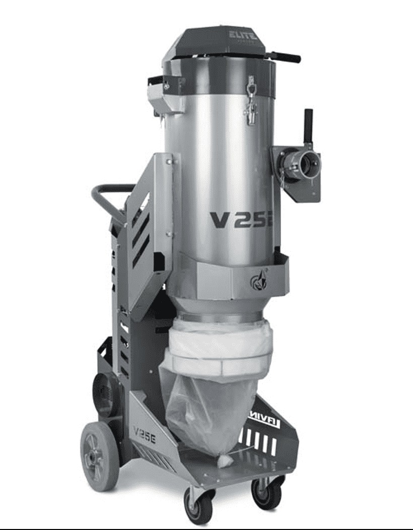 V25E is a mid-size electric vacuum, offered in 115V and 220V models, and suitable for use with 25″/30″ floor grinders.