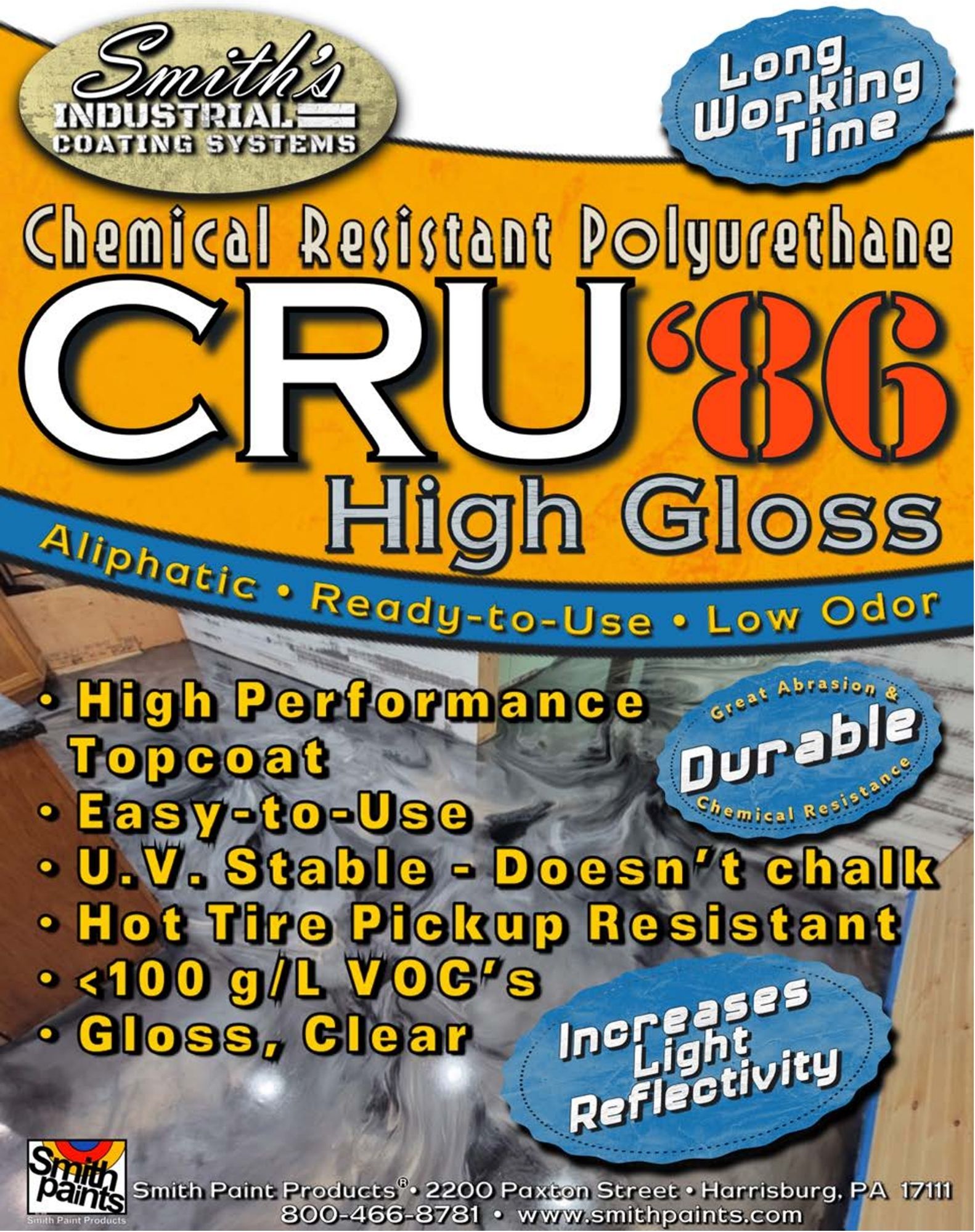 Smith’s CRU’86 is a High Performance, Ready-to-Use, High Gloss, 86% Solids, Aliphatic, Solvent-based Chemical Resistant Polyurethane topcoat which yields a highly light reflective, smooth finish when applied at 400 sq.ft. per gallon as a gloss finish over a properly prepared coating or primer layer.