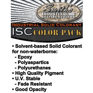 Smith’s ISC Industrial Solid Color Packs were developed as a pigment dispersion which allows the contractor to use a single color pack across several solvent-borne resin types, such as Epoxy, Polyurethane and Polyaspartic products. Smith’s ISC Color Packs reduces the risk of accidentally using the wrong type of pigment in the wrong type resin.